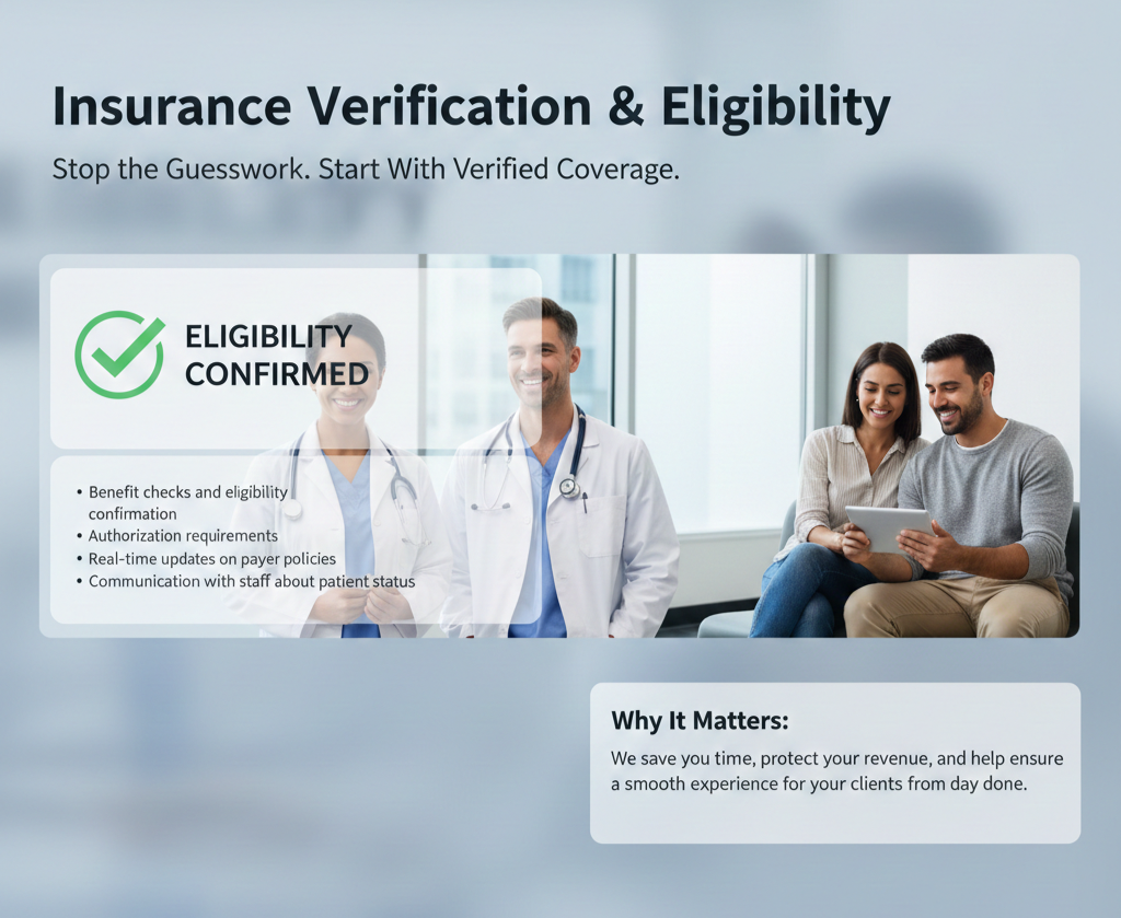 Unverified insurance benefits lead to claim rejections and frustrated clients. Our team verifies eligibility upfront — so you can offer services confidently, without payment risks.
